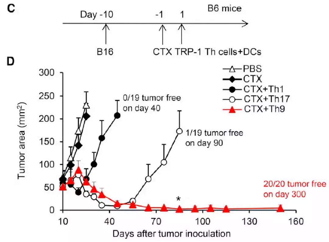 在最新的這項(xiàng)研究中,Yong Lu組和Qing Yi組的研究人員利用天然TRP-1抗原特異性的Th9細(xì)胞,采用了跟臨床T細(xì)胞治療幾乎相同的治療方案,一次Th9細(xì)胞注射就徹底治愈了晚期小鼠腫瘤。值得注意的是這種B16小鼠黑色素瘤是免疫原性很低的腫瘤,并且對(duì)幾乎所有的治療方案都有嚴(yán)重抗性的腫瘤品種。成千上萬的研究使用這種B16小鼠黑色素瘤,但沒有任何貼近臨床的可行方案能徹底殺滅小鼠體內(nèi)的這種腫瘤,即便是早期的B16小鼠黑色素瘤(下圖)。