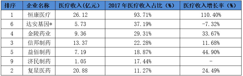 注:數(shù)據(jù)來源于各公司上市年報(bào),供參考。以2017年醫(yī)療服務(wù)收入占企業(yè)營業(yè)收入的比例排序。達(dá)安基因醫(yī)療服務(wù)收入包含少部分醫(yī)療檢測服務(wù)收入,無法剔除。數(shù)據(jù)資料供參考。