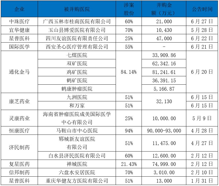 其中,涉及醫(yī)院的公開并購達(dá)到14起,總金額達(dá)65.47億元,涉及馬鞍山市中心醫(yī)院、禪城醫(yī)院、七煤醫(yī)院、雙礦醫(yī)院、白水濟(jì)民醫(yī)院、六盤水安居醫(yī)院等眾多醫(yī)療機(jī)構(gòu)。