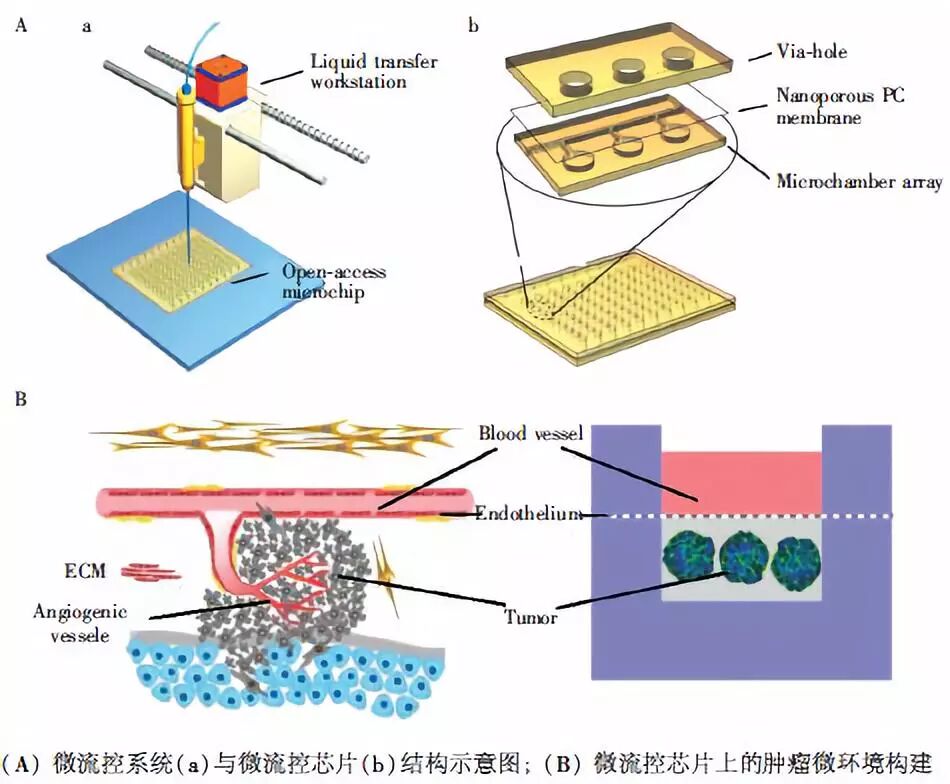 另外,微流控芯片還可用于構(gòu)建腫瘤微環(huán)境。該芯片具有3層復(fù)合式結(jié)構(gòu): 底層為微通道貫穿的細(xì)胞培養(yǎng)池陣列,頂層是開(kāi)放式培養(yǎng)池,二者之間為一層納米孔薄膜。納米孔薄膜具有“透氣阻水”的特性,既起到止流閥作用實(shí)現(xiàn)液體自動(dòng)分配,又允許跨膜擴(kuò)散,模擬血管內(nèi)皮層擴(kuò)散屏障結(jié)構(gòu)。結(jié)合移液工作站,開(kāi)放式微流控芯片可以完成細(xì)胞換液、藥物處理和細(xì)胞活力測(cè)試等一系列分析步驟。