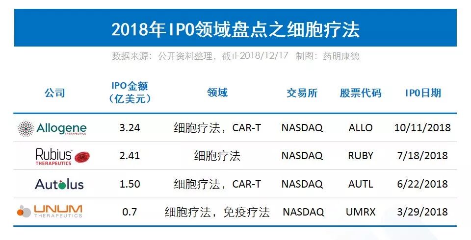 自2017年史上第一款CAR-T療法上市以來,研發(fā)不受患者自體T細(xì)胞限制的通用型細(xì)胞療法,成為下一代CAR-T療法的發(fā)展方向。與自體T細(xì)胞療法相比,通用型細(xì)胞來源于健康供體,有可能克服許多與癌癥治療相關(guān)的免疫缺陷;另外,制造工藝更加簡化,有望實(shí)現(xiàn)更快速、更便宜的“現(xiàn)成(off the shelf)”細(xì)胞療法產(chǎn)品。今年2月,法國Cellectis公司研發(fā)的UCART123成為FDA批準(zhǔn)進(jìn)入臨床試驗(yàn)的首款通用型CAR-T療法,經(jīng)歷暫停(clinical hold)后11月再次獲得FDA放行,通用型CAR-T細(xì)胞療法繼續(xù)向前發(fā)展。2018年,4家細(xì)胞療法企業(yè)公司完成IPO,其中通用型CAR-T受到資本關(guān)注。